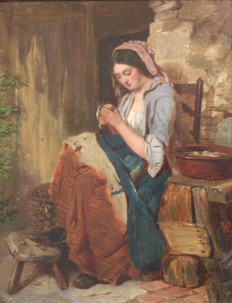 Girl peeling potatoes in a cottage doorway