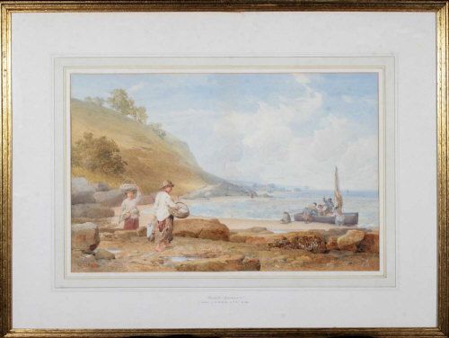 COCKLE GATHERERS - FIGURES AND A SMALL BOAT ON A ROCKY SHORE