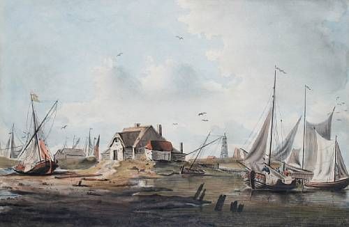 Sailing barges and fishing boats by a jetty at low tide, near London