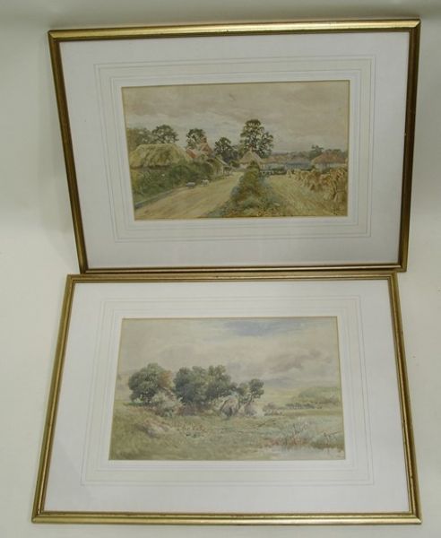 A country scene, hay cart and figure and COMPANION, sheep on a country lane