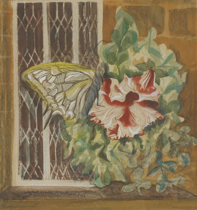 | A BUTTERFLY ON A FLOWER, ON A WINDOW SILL | |