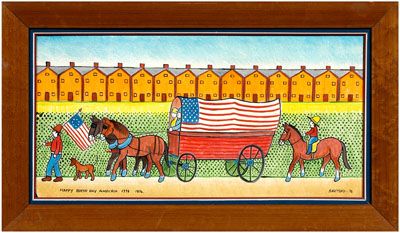 | “Happy Birth Day America 1776-1976”, flag-decorated covered wagon, figure on horse, dog, figure holding flag in procession | |