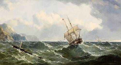 Vessel in full sail off a coastline