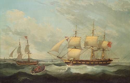 A British Man o' War offshore with other shipping