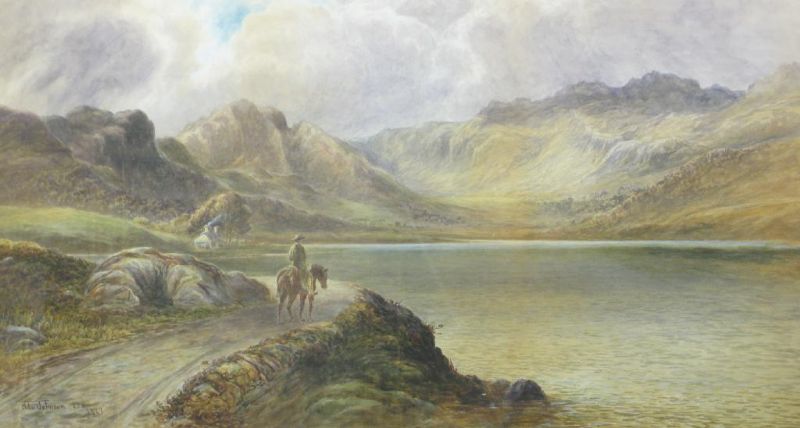 A Welsh Lake Landscape with a figure on horseback in the foreground