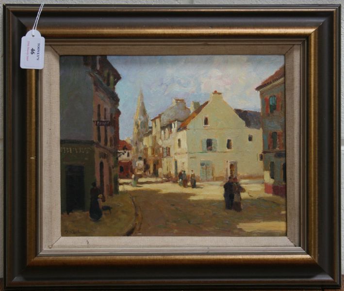 View of a Continental Street with Figures by a Building, a Spire in the distance