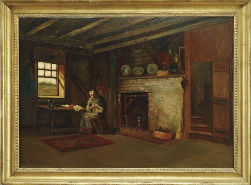 | Oil on canvas scene shows an old woman in a Windsor rocker mending a bonnet. An open window has sunlight shining through with landscape outside. She sits next to a tavern table with a pewter pitcher and plate with fabric | |