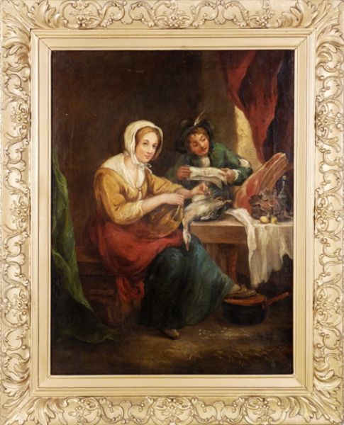 A WOMAN PREPARING A DUCK AT A TABLE, A BOY READING A NEWSPAPER