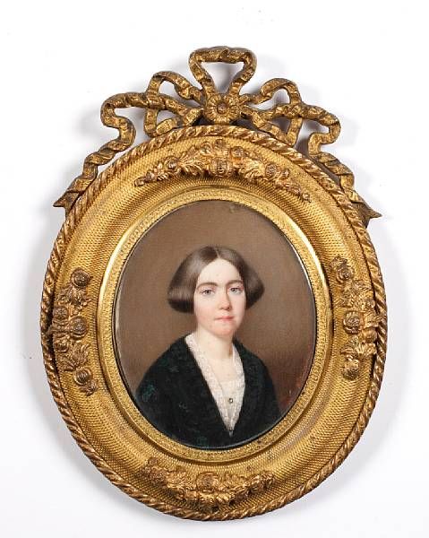 | A Lady, wearing black dress with white lace trim and slip, onyx cameo at her corsage, her brown hair parted | |