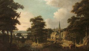Capriccio view of a village scene with drovers and cattle with a river woodland and mountains in the distance