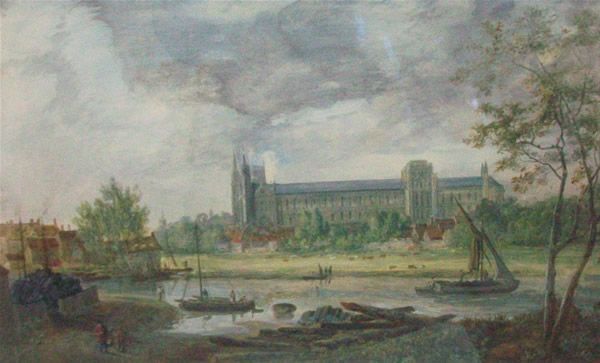 Peterborough Cathedral, shown from across the river with sailed boats, local interest