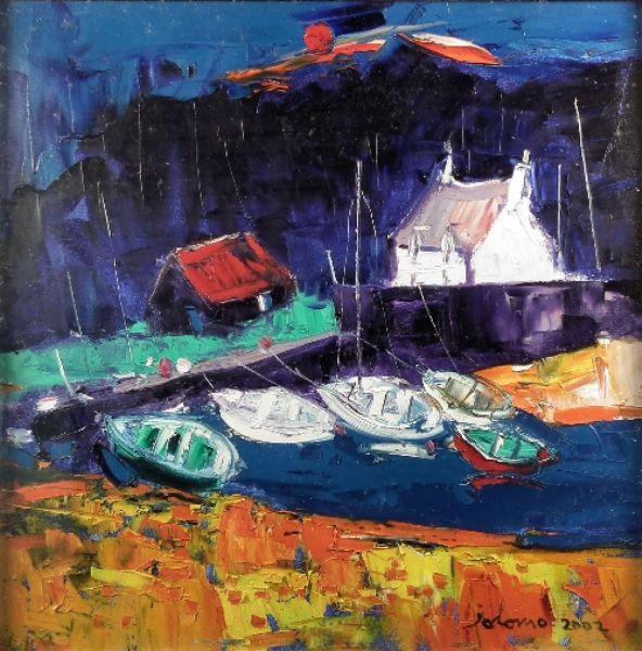 | Sunset - Kilchoan, (Argyll, Scotland) - Harbour scene with fishing boats and cottages to background | |