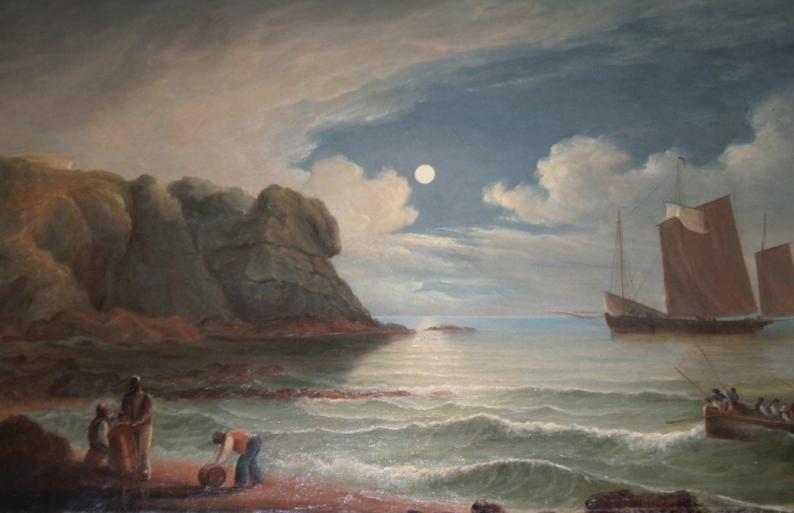 | A FISHING BOAT HAULING IN SAIL IN COASTAL WATERS; SAILORS COMING ASHORE AT DUSK | |
