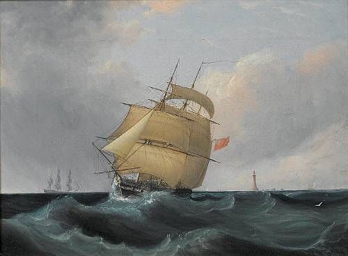 An outward-bound frigate running past the Eddystone lighthouse in a stiff breeze