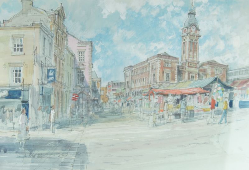 A town scene with market place and figures