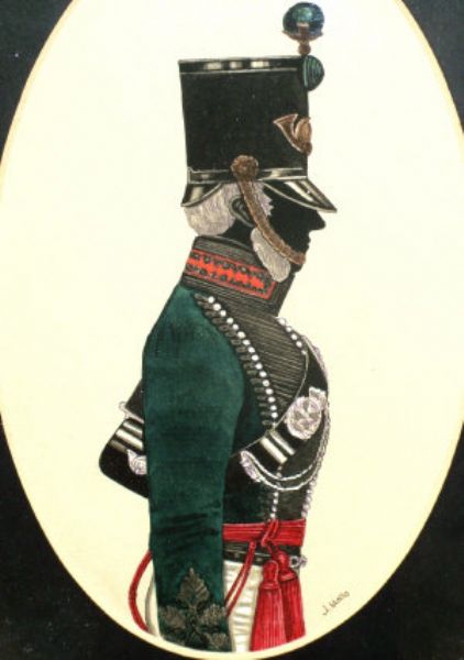 | Silhouette portrait of a 19th century British Infantry officer standing three quarter-length in profile in full dress uniform | |