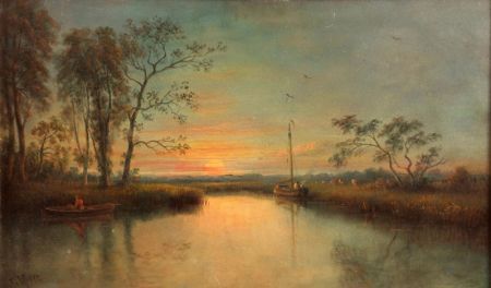 | East Anglian River Scene at Sunset with Barge and Rowing Boat, Cattle Grazing in Distance | |