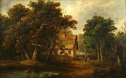 Figures before a thatched cottage in woodland