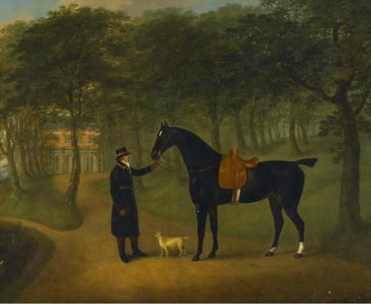 A SADDLED HORSE WITH GROOM OUTSIDE A COUNTRY HOUSE