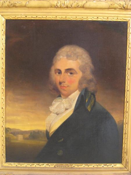 | Portrait of William Clark, quarter-length, wearing a dark blue Jacket, with Buckland-Tout-Saints hHouse, Kingsbridge beyond | |