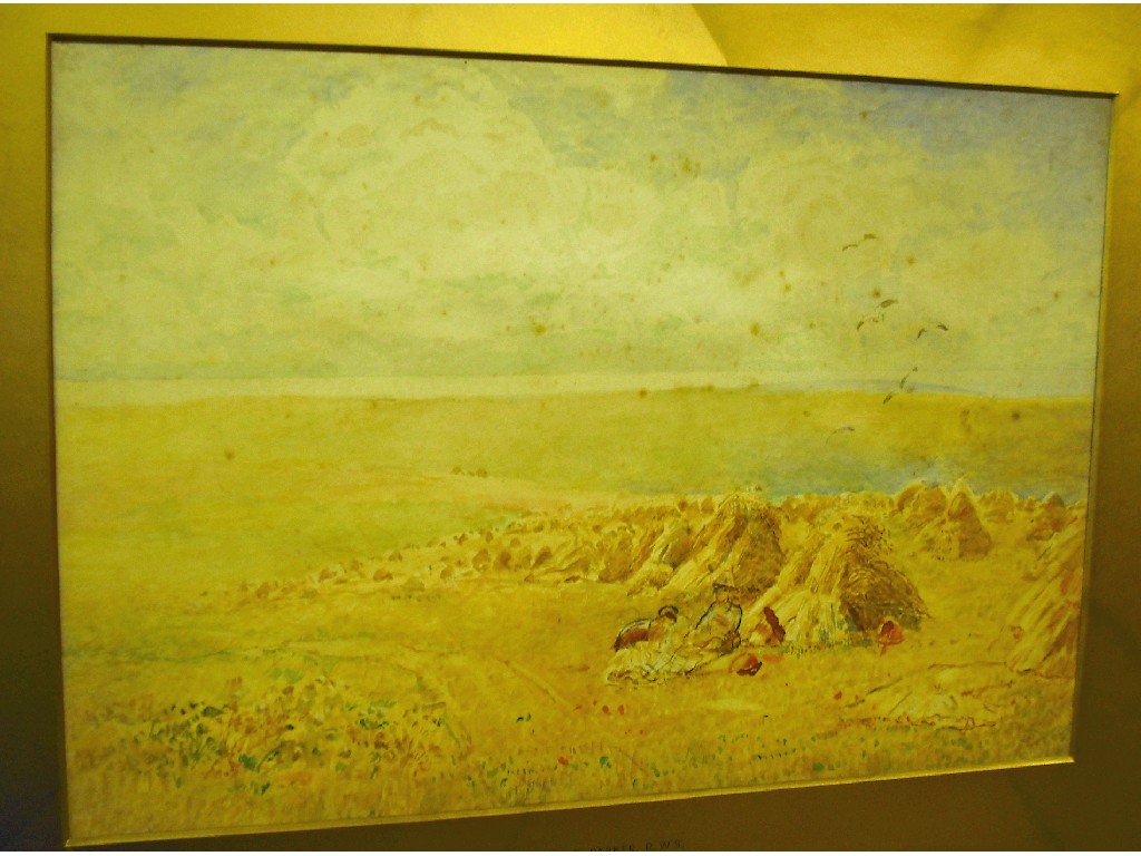 Sketch of a lady seated by hay bales in a field, the coast beyond