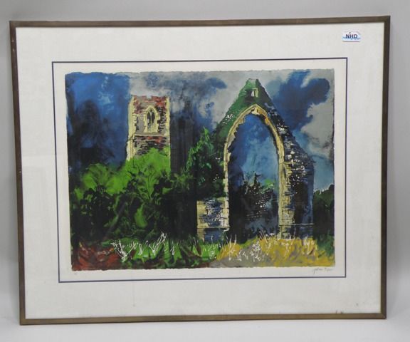 A church ruin with blue sky, green foliage and an arch in the foreground