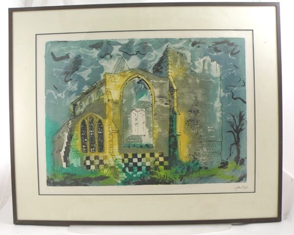 A ruined chapel with yellow tinted stonework and chequer boarding below