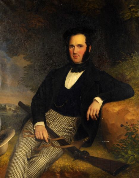 | Portrait of Mr Garratt, three-quarter length, seated, with shot gun on his lap, wearing a black jacket and chequered trousers, a | |