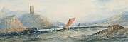 Fishing boats off a coast with castle ruins