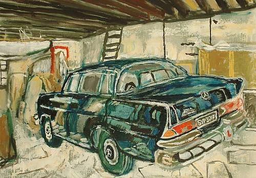 Blue Mercedes in a garage