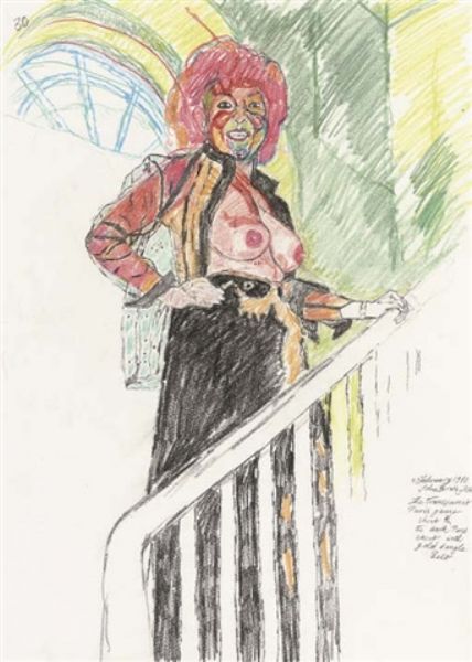 | The transparent Paris gauze shirt & the dark Paris skirt with gold dangle belt | |