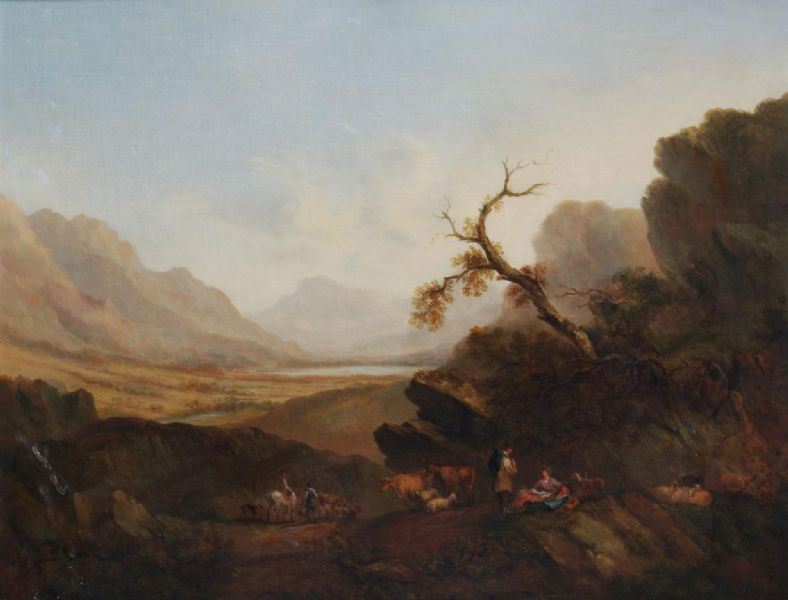 An extensive river landscape with figures resting, cattle and sheep, mountains beyond