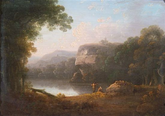 | Figures on a country track with town and coast in the distance and river lanscape with figures | |