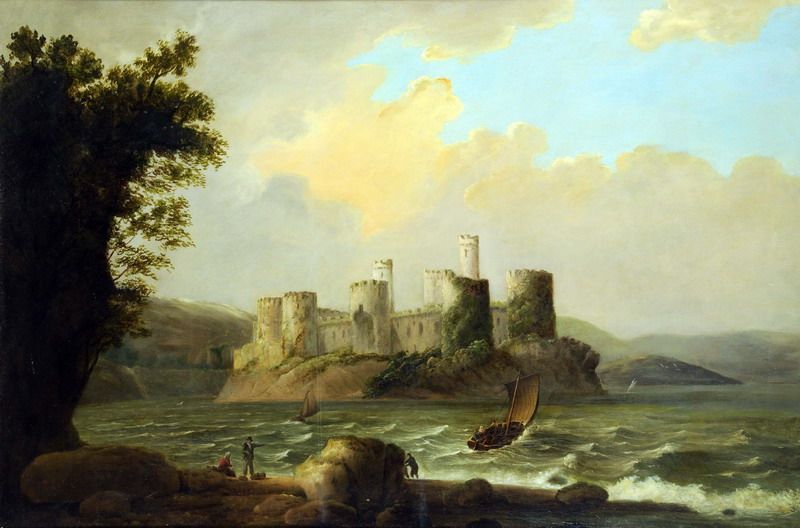 | North Welsh landscape scene showing sailing vessel on stormy waters before the Medieval fortification of Conwy Castle | |