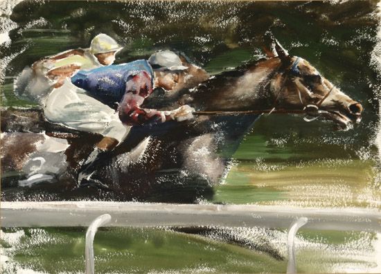 | Watercolor and gouache on paper; with some fading and mat toning along the margins. Framed. | |
