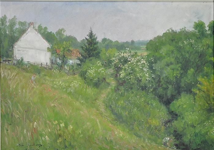 Impressionistisches Waldstück mit Blick auf Gehöft.