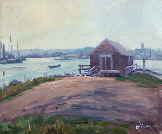 harbor scene with fishing shack