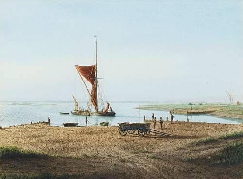 | A spritsail barge arriving at a creek in the Thames estuary, with workmen nearby, shovels at the ready, waiting to unload her | |