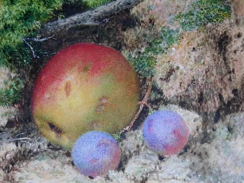 AN APPLE AND TWO GRAPES AGAINST A GRASSY BANK