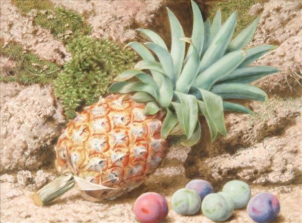 | Still life of pineapple, plums and greengages on a mossy bank | |