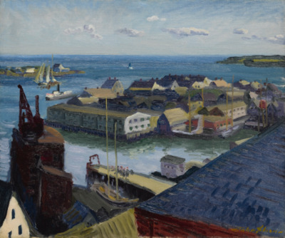 signed -John Sloan- (lower right); also inscribed BLUE HARBOR and G6 (along the right tacking edge).
