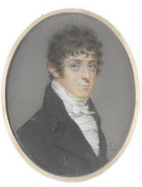A Gentleman, wearing black coat, white frilled chemise and tied stock.