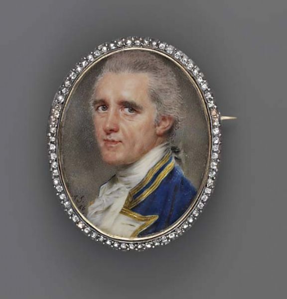 | A naval Captain in gold-bordered naval uniform with white facings and cravat, powdered hair en queue | |