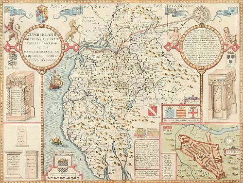 | Engraving engraved map, hand coloured, with town plan of 'Carlile' and engravings of roman antiquities | |