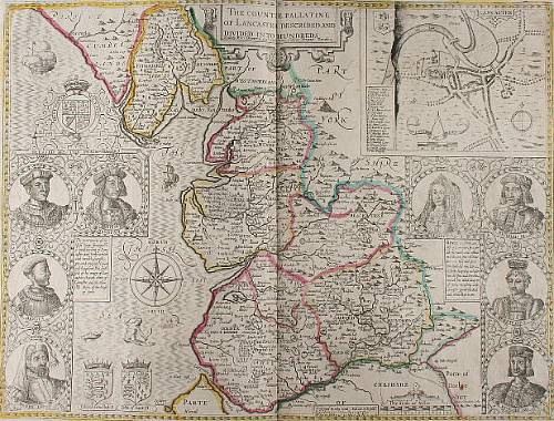 | Engraving map, outline hand colouring, with town plan of Lancaster, medallion heads of monarchs | |
