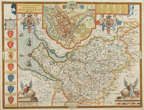 Engraving engraved map, hand coloured, with inset town plan of Chester