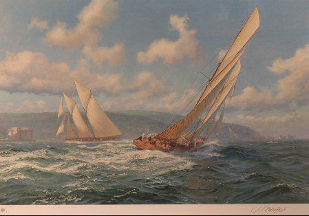 Yachts Germania and Meteor IV racing in the Solent off Fort Albert, the Needles in the background