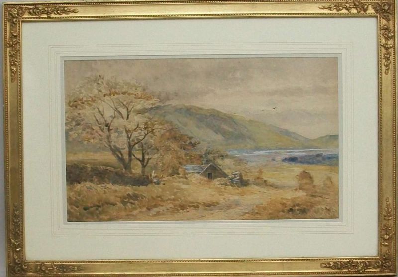 | a Welsh landscape, 'Half tide in the Vale of LLannellyd', with figures by a cottage | |
