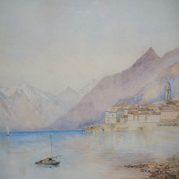 Continental lake scene with sailing boat in foreground