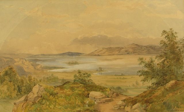 Loch Lomond, a view with boulders in the foreground, still waters and distant hills